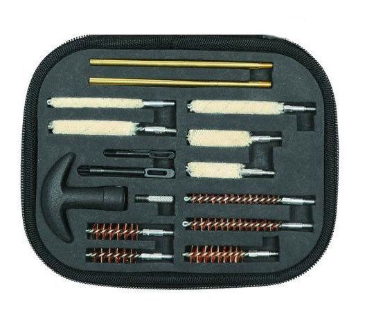 Набор содержит 16 элементов, показанных на рисунках. Складной набор в футляре с молнией для чистки и смазки огнестрельного оружия и пневматических пистолетов. Футляр выполнен из качественной нейлоновой ткани. Внутри, под каждый предмет, есть выемки особой формы для удобного хранения.
